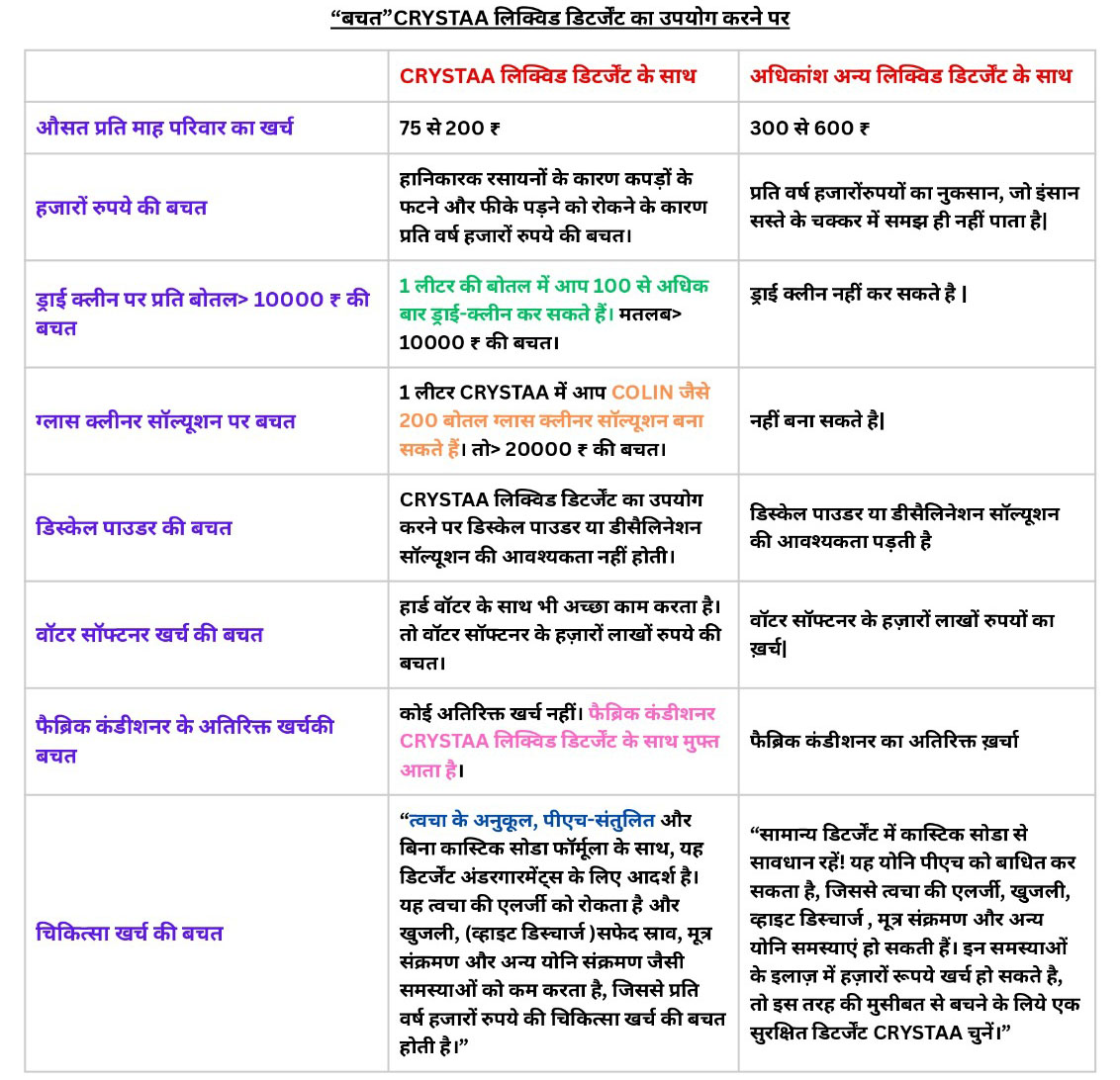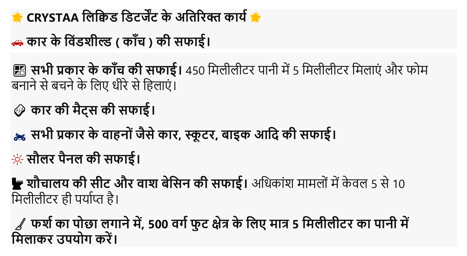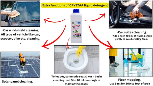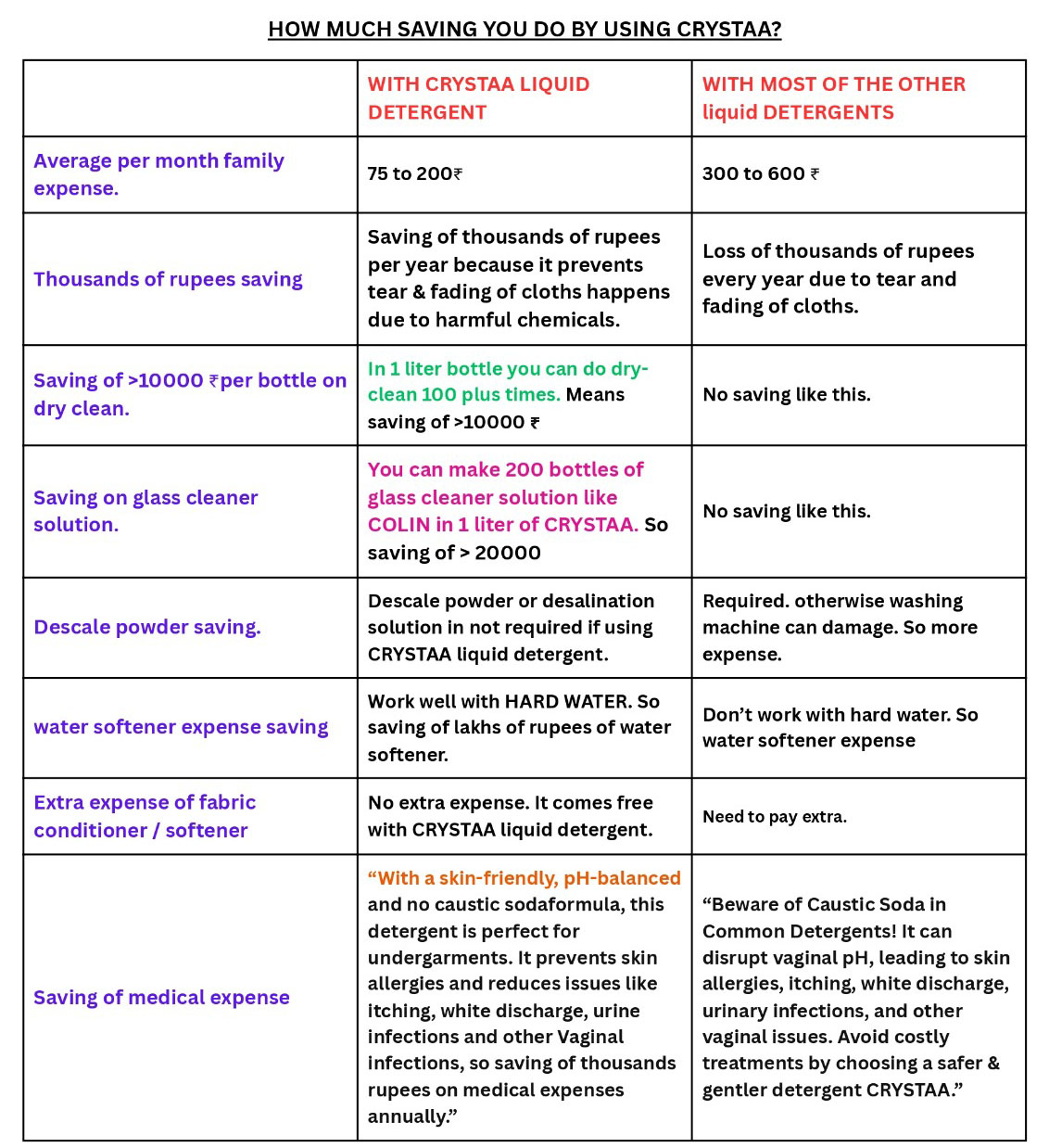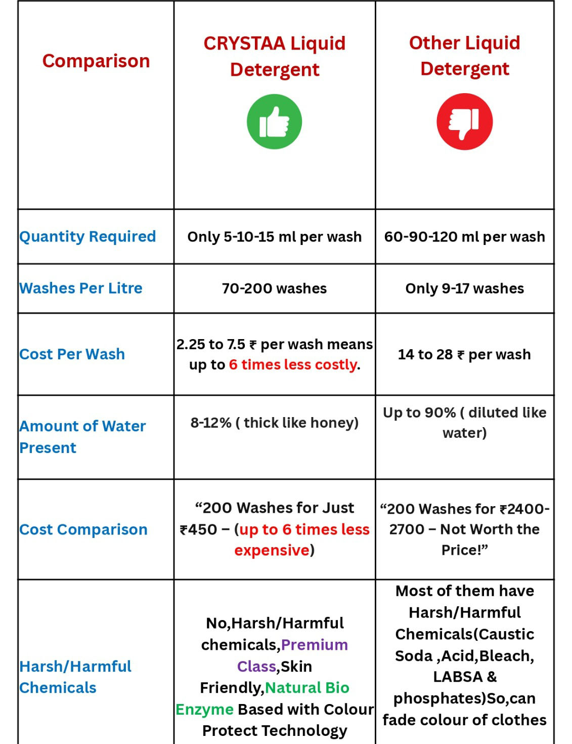 CRYSTAA Liquid Detergent is highly concentrated, ensuring that a little goes a long way. This makes it a cost-effective choice for your laundry needs. Starts from 2.25 Rs per wash & lasts up to 5 times longer.