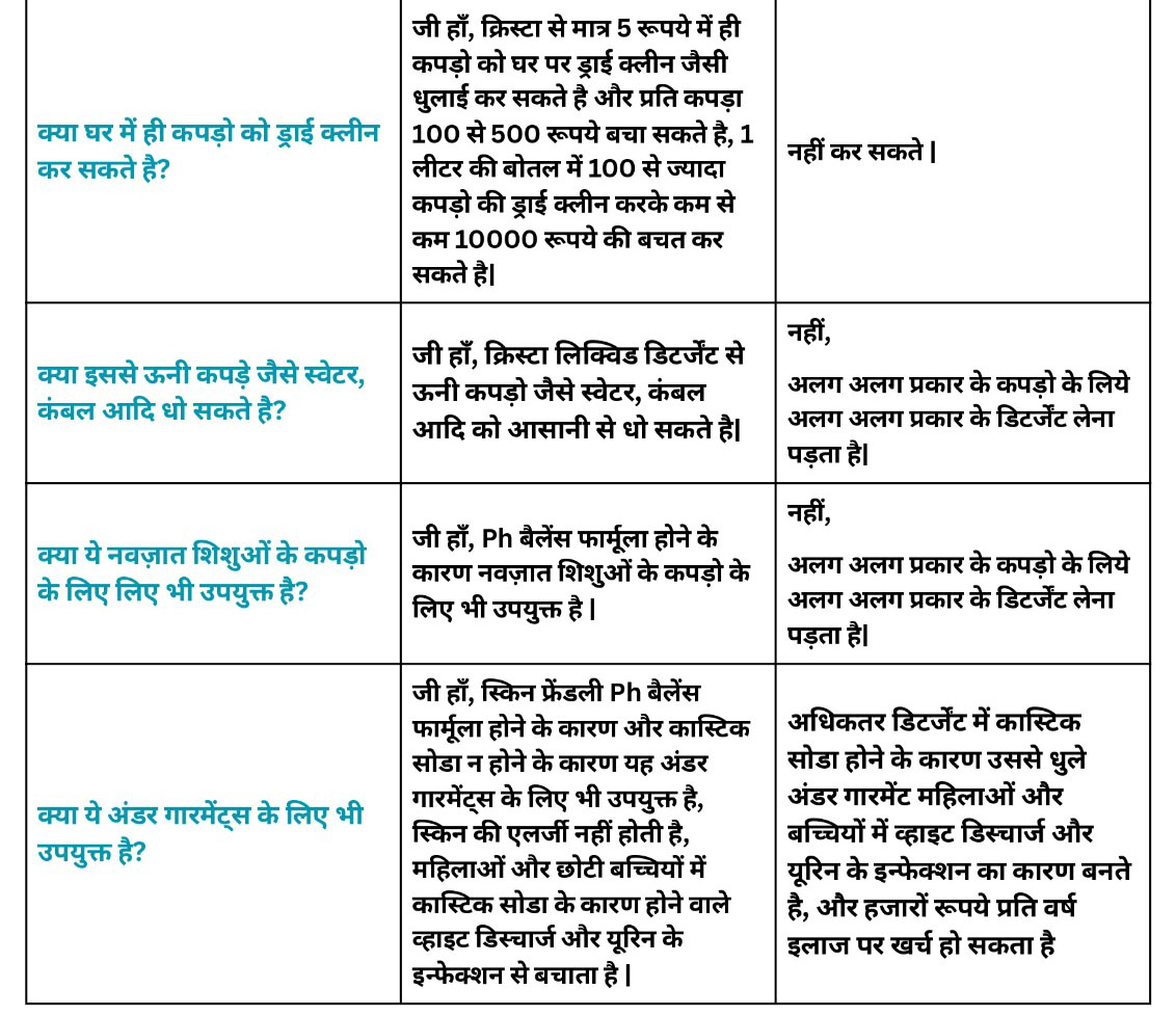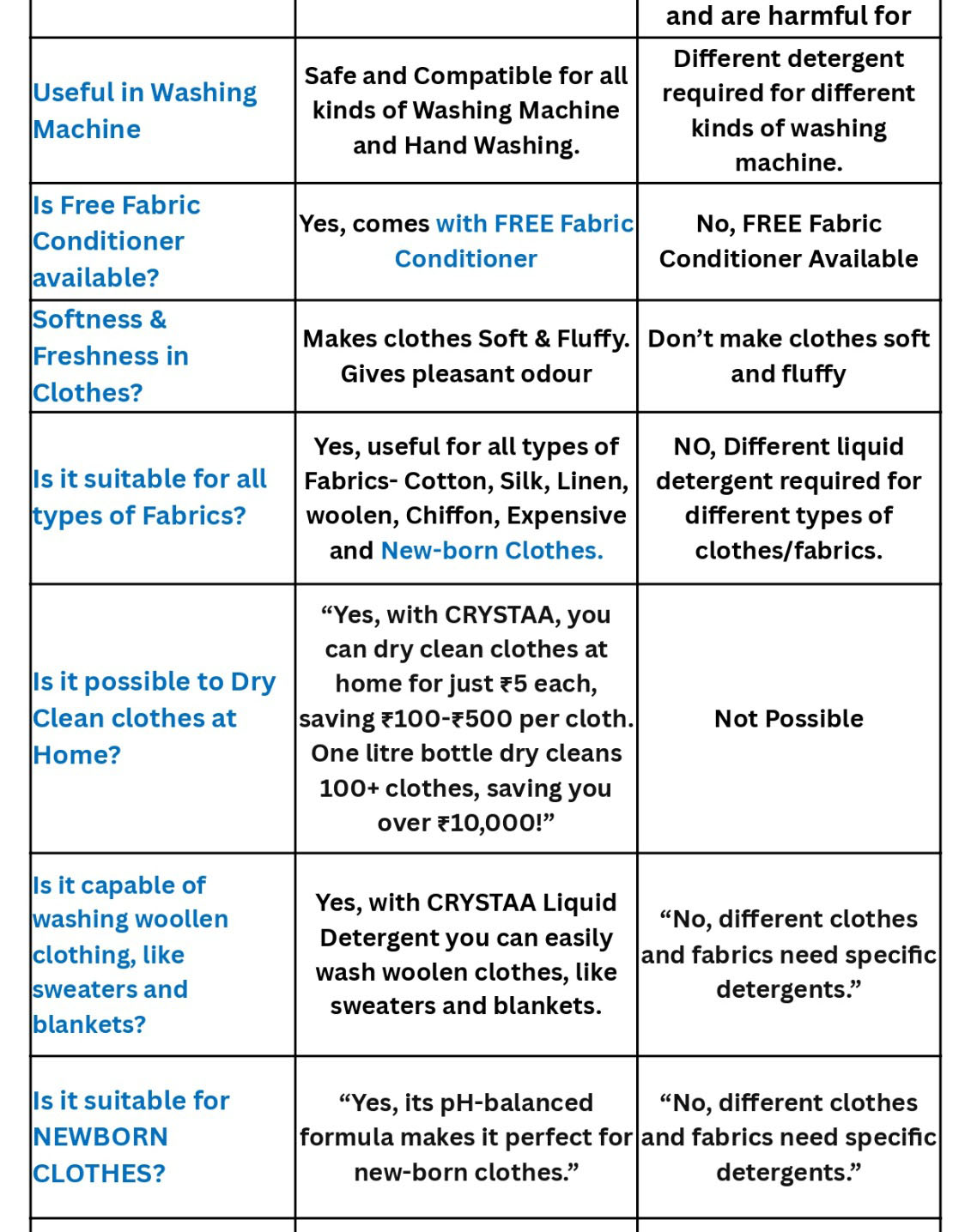 CRYSTAA Liquid Detergent is suitable for a wide range of fabrics, including woolens, cotton, linen, chiffon, silk, expensive clothes & new born cloths. It caters to delicate and high-quality materials.